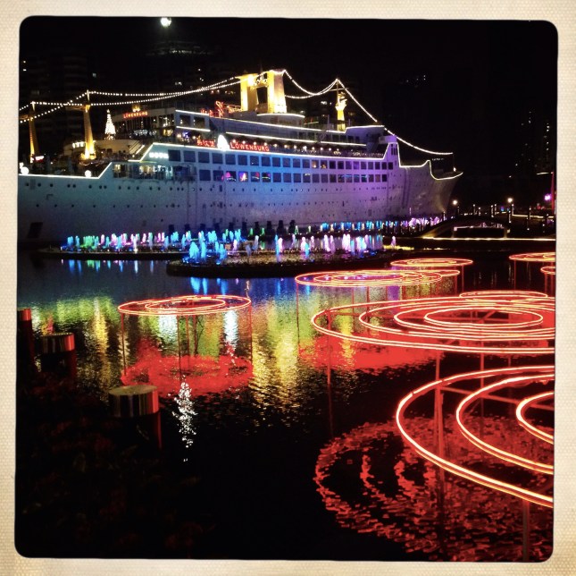 At night I went to Seaworld. A funny place for tourists with many international restaurants and bars. There was even German beer! Paulaner and others and I could see two or three western faces in the crowd more than everywhere else in the city. The staff of the restaurants could even speak english. I had a nice italian meal (or what they call italian), watched a band play and a water show with music which was really great!